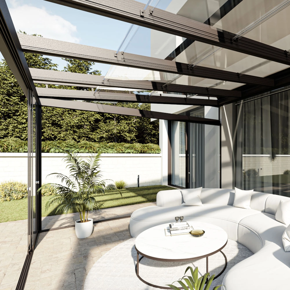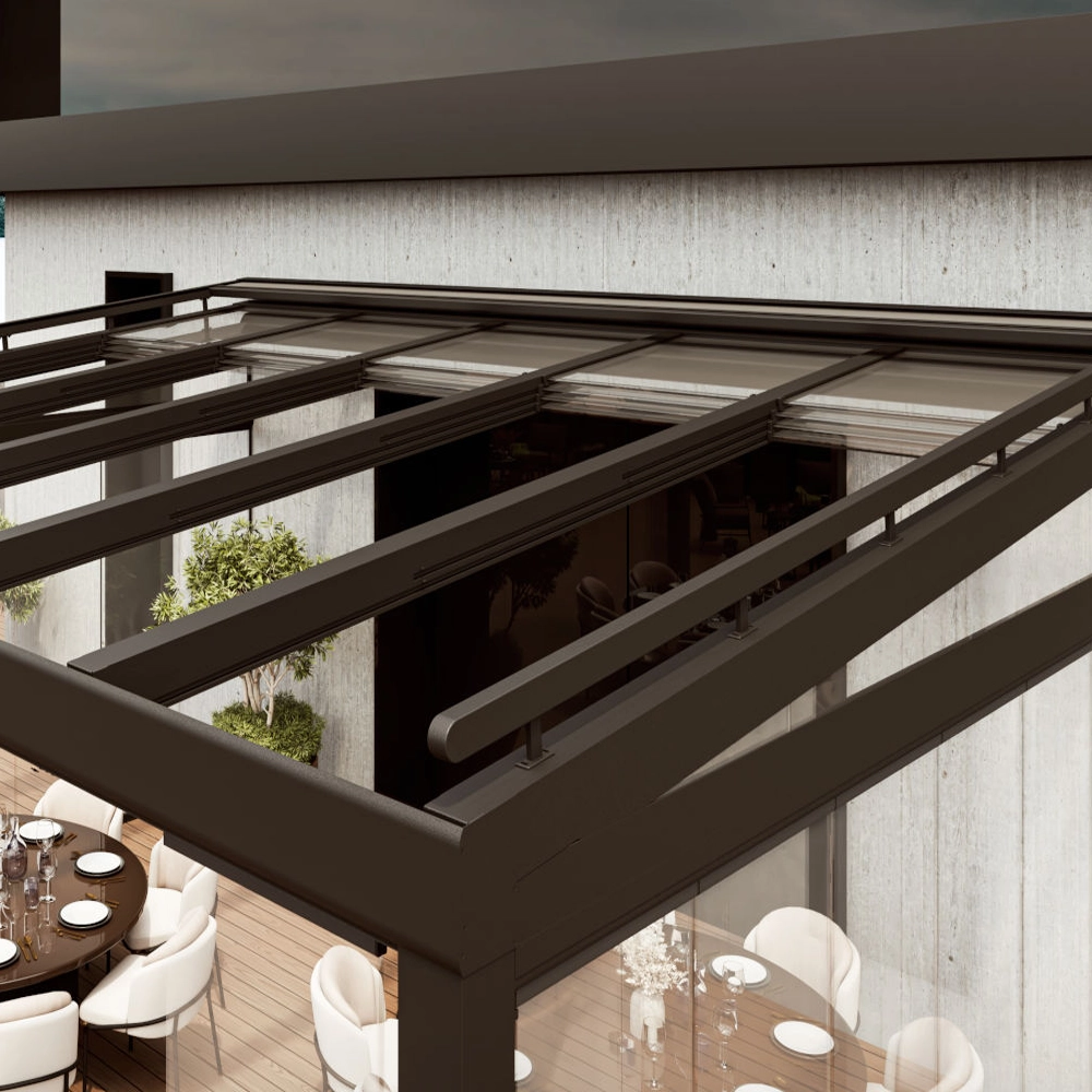 Takket være det motoriserte glasstaksystemet tillater terrassetaket SKIEN gradvis ventilasjon av det overbygde rommet, ved at åpningen av panelene kan justeres etter ønske. Det er et system som ikke er sesongbasert, og sikrer bruk hele året. Dets effektivitet og allsidighet gjør det til det perfekte produktet for ethvert uteområde.